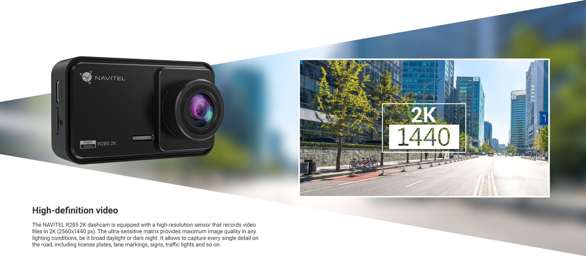 The Navitel R285 2K dashcam is equipped with a high-resolution sensor that provides recordings in 2K (2560x1440p). The ultra-sensitive matrix provides maximum image quality in any lighting conditions, be it broad daylight or dark night. It allows the R285 2K to capture every detail of your journey, including number plates, lane markings, signs, traffic lights and more.