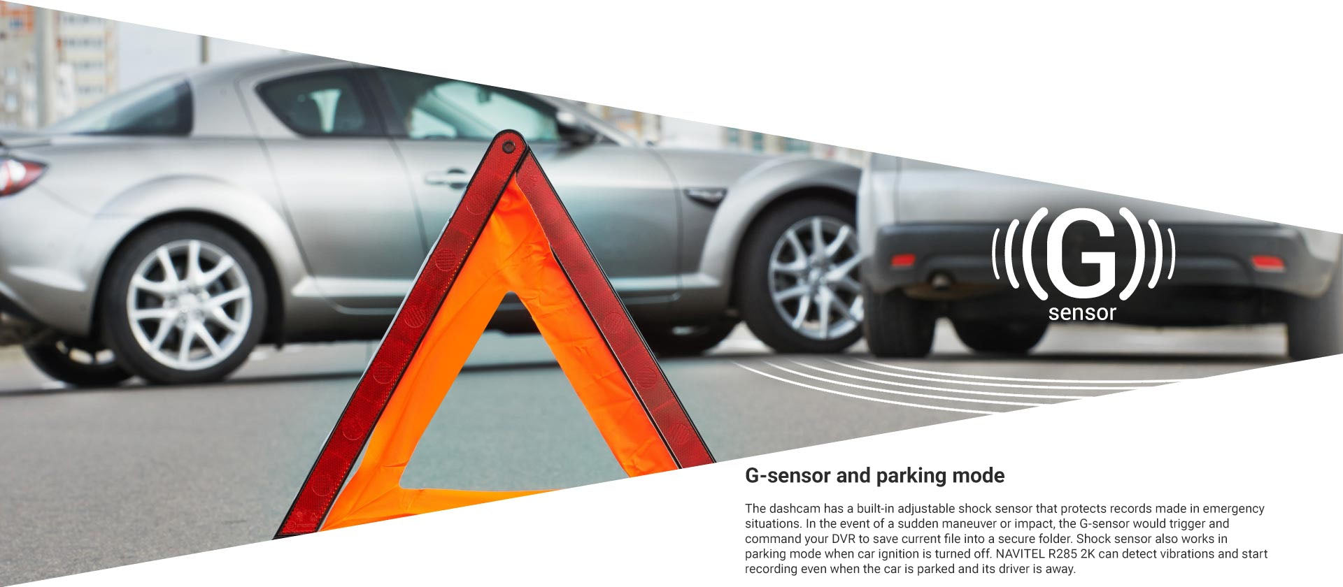 This Navitel dash cam has a built-in adjustable shock sensor that protects clips made in emergency situations. In the event of sudden maneuvers or impact, the G-sensor will trigger and save the current file into a secure folder that can not be overwritten. G-sensor also works in parking mode when the car is turned off. Navitel R285 2K can detect vibrations and start recording, even when the car is parked, and the driver is away.